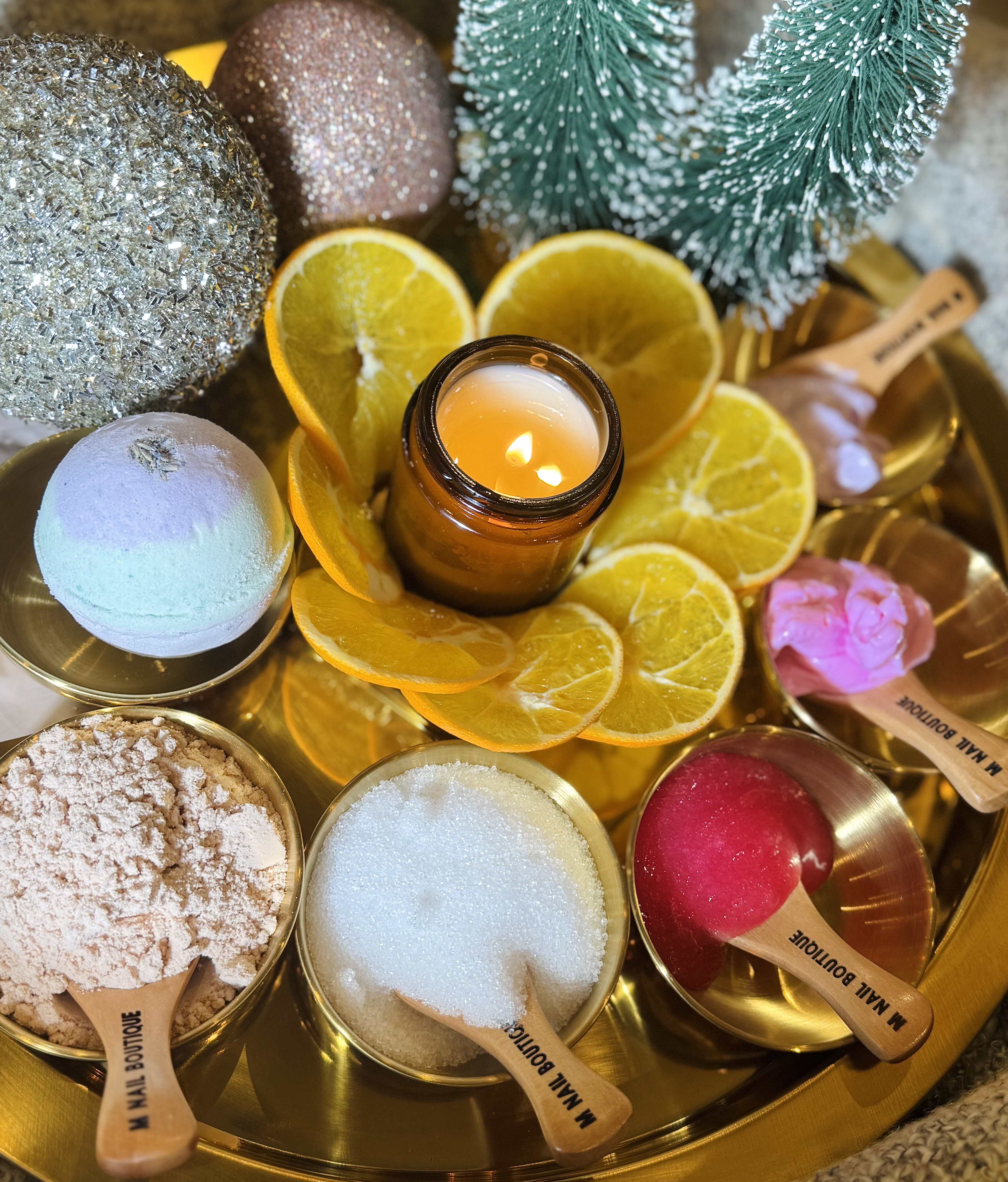 • Rose champagne soak with petals, orange slices & bath bomb fizz